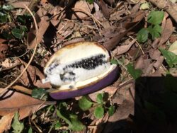 紫色の皮がぱっくりと割れて果肉が顔を出すアケビの実。白いゼリー状の果肉はとっても甘いですが、種が多くて少し食べづらいです。皮が割れない「ムベ」の実も園内で見ることができます。